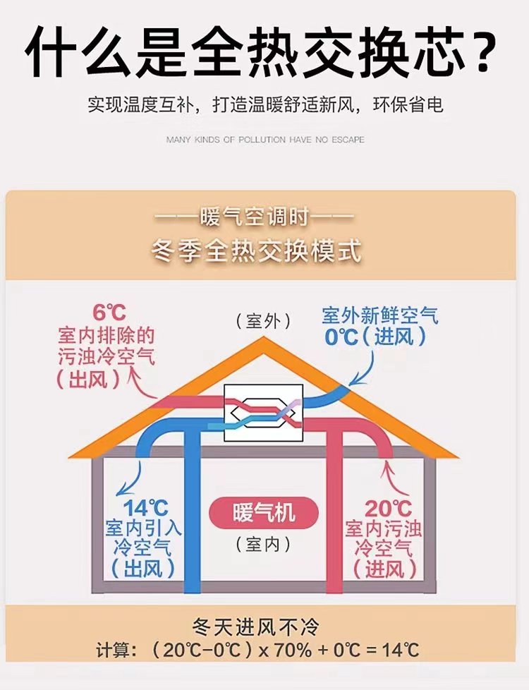 那在冬季的時候呢,還可以利用室內暖氣的能量,對室外的冷空氣進行預熱,再送回室內,這樣室內的暖氣的能量損失減少,并且可以給進入室內的新風加濕,因此無論是夏季還是冬季進入室內的新風都可以通過全熱交換芯體,從排出去的空氣中回收能量,從而降低能耗,節約能源,達到健康舒適環保的目的,另外全熱交換效率越高,交換時損失的能量也就越少,也會更加的節能。